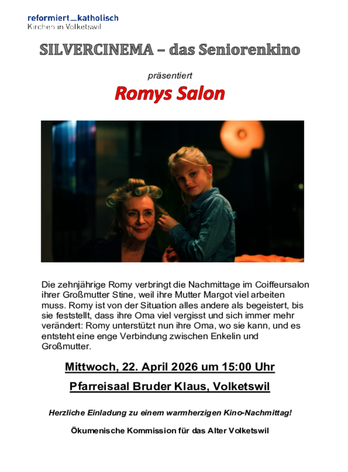 Die Ökumenische Kommission für das Alter Volketswil bietet am 22. April, um 15 Uhr im Pfarreisaal Bruder Klaus unter dem Angebot SILVERCINEMA – das Seniorenkino den Film «Rosys Salon» an. Ein feinfühliger, berührender Film in deutscher Sprache. Regie: Mischa Kamp. Die zehnjährige Romy verbringt die Nachmittage im Coiffeursalon ihrer Grossmutter Stine, weil ihre Mutter Margot viel arbeiten muss. Romy ist von der Situation alles andere als begeistert, bis sie feststellt, dass ihre Oma viel vergisst und sich immer mehr verändert: Romy unterstützt nun ihre Oma, wo sie kann, und es entsteht eine enge Verbindung zwischen Enkelin und Großmutter. Herzliche Einladung zu einem Kino-Nachmittag mit einem warmherzigen Film nach dem Bestseller-Roman von Tamara Bos. Der Eintritt ist frei, es wird eine Kollekte erhoben. Ökumenische Kommission für das Alter Volketswil