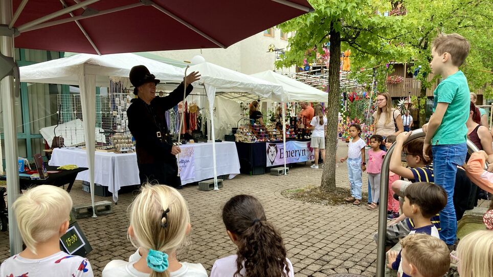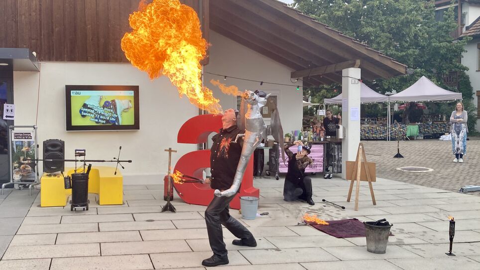 Ein kleiner Zug fuhr auf dem Festivalgelände im In der Au im Kreis, vorbei an einem Zauberer, der zerschnittene Seile wieder zusammenfügte und Bälle verschwinden liess. Mit einem lauten Knall produzierte ein zerzauster Erfinder Popcorn mit einer selbstgebauten Maschine. Dieses gab es in Sorten wie Mediterran oder Amaretto zu kaufen. Ein Feuerkünstler spuckte und schluckte Flammen unter den faszinierten Blicken der Besucherinnen und Besucher. «Liebe Kinder, sagt euren Eltern, dass sie das nicht nachmachen sollen!», rief er.