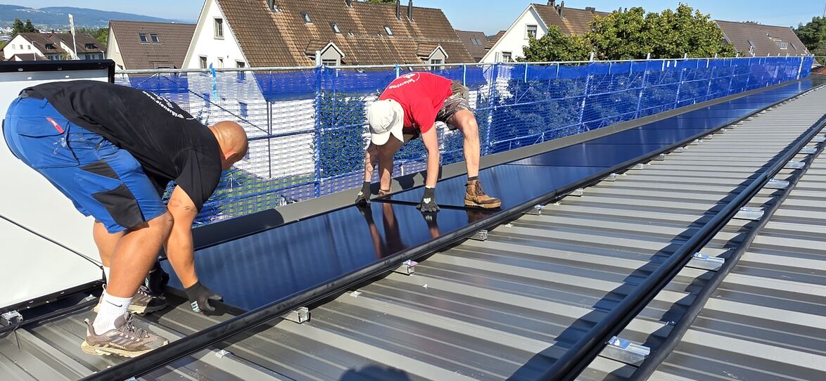 Die 25-jährige Schnitzelheizung im Schulhaus Gutenswil war seit einigen Jahren stark reparaturanfällig und musste deshalb ersetzt werden. In den Sommerferien und in den ersten beiden Wochen des neu gestarteten Schuljahres wurde neu eine Luft-Wärmepumpe mit Photovoltaik-Anlage installiert. Diese neue Heizungslösung ist wirtschaftlich sinnvoll und leistet einen wichtigen Beitrag zur CO2-Neutralität der Gemeinde. Die Dachfläche in Gutenswil eignet sich aufgrund ihrer Lage und Grösse hervorragend für den Einsatz einer Photovoltaikanlage. Da das Dach in einem sehr schlechten Zustand war, musste mit dem Wechsel auf das neue Heizungssystem und vor der Installation der PV-Anlage auch das Dach saniert und eine neue Dachdeckung angebracht werden. Die 432 Quadratmeter grosse Solaranlage produziert rund 100‘000 Kilowattstunden Strom pro Jahr. Die Energie, welche die Anlage produziert, wird für den Eigengebrauch der Dorfschule und der Quartieranlage verwendet. Der Überschuss fliesst ins lokale Stromnetz und kann den umliegenden Anwohnern zu einem günstigeren Tarif durch die EKZ angeboten werden. Sollte im Winter einmal zu wenig Energie produziert werden, kann aus dem lokalen Netz Strom bezogen werden. «Unterm Strich wird uns die Energie kaum noch etwas kosten», sagt Markus Wiedmer, Leiter Liegenschaften der Schule Volketswil. Gemäss Berechnungen mit den heutigen Strompreisen kann die PV-Anlage in neun Jahren amortisiert werden. Die Schulpflege hatte die Kosten in Höhe von 190‘000 Franken für den Heizungsersatz mit Wechsel auf eine Luft-Wärmepumpe im März 2025 genehmigt. Ebenso die Dachsanierung und den Einbau einer Photovoltaikanlage mit Kosten in Höhe von jeweils 150‘000 Franken.