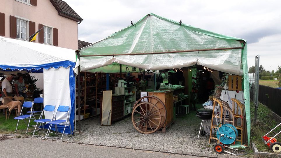 Kein Wunder, dass angesichts des vielfältigen Warenangebotes, der Flohmarkt bald einmal an drei, dann an vier Tagen stattfand. Sinnvoll auch, wenn man bedenkt, dass sich Auf- und Abbau jeweils über eine Woche hinziehen. Aber für Hächler überwog das Positive. Der Verkauf auf dem Flohmarkt „ist auch insofern schön“, stellt er fest, „weil man mit der Kundschaft ins Gespräch kommt. Für mich ist das noch wichtig gewesen“. Und die Kundschaft kam nicht nur aus dem Dorf sondern auch aus verschieden Kantonen, ein Grossteil von ihnen waren gar Stammgäste. Natürlich waren die einzelnen Stände von Anfang an überdacht, doch wirklich regensicher waren sie nicht und der Rasen zwischen ihnen verwandelte sich bei schlechtem Wetter häufig in eine matschig-rutschige Unterlage, der mit Bretterwegen auch nicht wesentlich beizukommen war. Doch Familie Hächler blieb nicht untätig. Von Markt zu Markt nahmen nicht nur die ausgestellten Waren zu, sondern sie wurden auch überdacht von zusammenhängenden Plastikblachen und das ganze Areal wurde bekiest - und damit gleichzeitig in seinen Urzustand zurück versetzt.