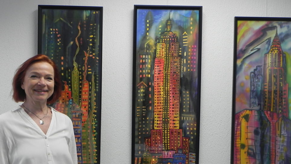 Die ausgebildete Hörgeräte-Akustikerin, welche seit 2004 bei Phonak arbeitet, hat das Seidenmalen schon vor über 30 Jahren entdeckt. Nach ein paar Kursen hat sie seither zuhause diese Kunstform weiterverfolgt. "Ich male immer in Begleitung von klassischer Musik". Im regen Austausch mit ihrem Lebenspartner kommen immer wieder neue Ideen zustande, so unter anderem auch die jüngste Ausstellung. Dabei geht es um New York und Äpfel. "Ich liebe diese Stadt, sie ist so lebendig und punkto Kunst einfach unübertrefflich. Tagelang könnte ich mich in den bekannten Museen wie The Metropolitan oder im Museum of Modern Art verweilen“.