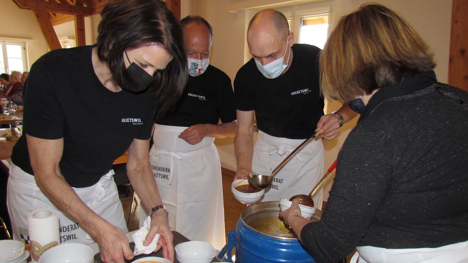Am Senig-Suppenzmittag standen gestern Samstag die sieben Gemeinderaete und Gemeindeschreiber Beat Grob am Suppentopf. Mit knapp 70 Gaesten war es zugleich auch der bislang bestbesuchte Anlass in dieser Saison, wie das OK-Team bestaetigte. Gesundheitsvorstand Christian Knechtle bereitete eine rassige, ungarische Gulasch-Suppe zu, die ihm viel Lob und Applaus eintrug. Abgerundet wurde der traditionelle Suppen-Schmaus mit selbstgebackenene Kuchen, Kaffee und einer Gesangseinlage der Gastgeber, welche allerdings nicht live sondern ab Video erfolgte.