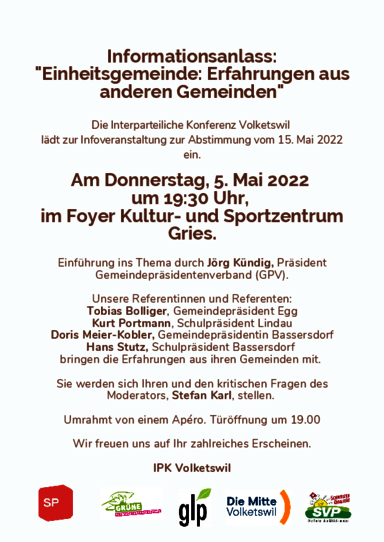 Unter der Moderation von Stefan Karl werden Tobias Bolliger (Gemeindepräsident Egg), Kurt Portmann (Schulpräsident Lindau), Doris Meier-Kobler (Gemeindepräsidentin Bassersdorf) und Hans Stutz (Schulpräsident Bassersdorf) von den Erfahrungen aus ihren "Einheitsgemeinden" berichten. Das Publikum hat im Anschluss die Möglichkeit, den Referentinnen und Referenten kritische Fragen zu stellen. Jörg Kündig, Präsident des Gemeindepräsidentenverbands, wird den Abend mit einer Einführung ins Thema eröffnen. Die Türöffnung ist um 19 Uhr und der Anlass wird von einem Apéro umrahmt.