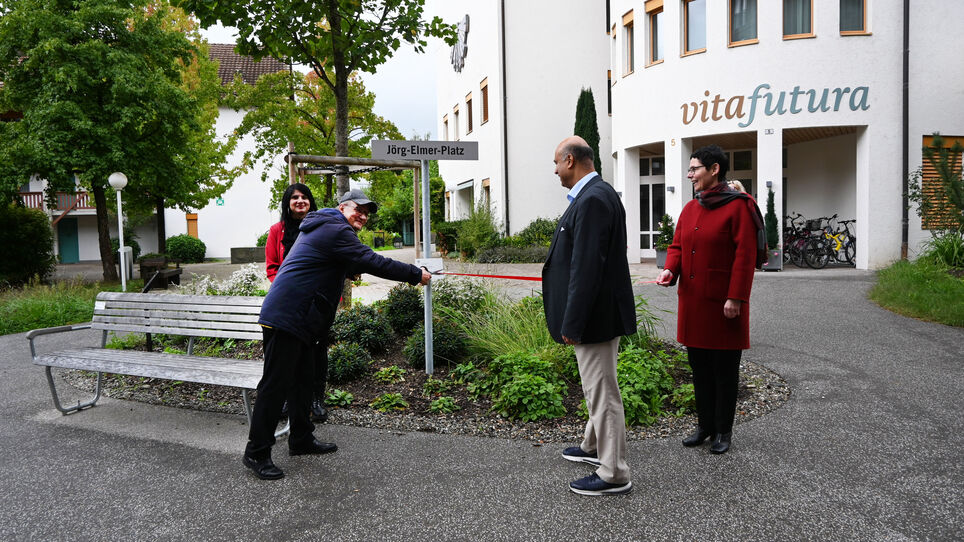 Unter den Festrednern und -rednerinnen war auch Marlies Petrig vom Verwaltungsrat der VitaFutura AG. «Es war vielen Volketswilerinnen und Volketswilern ein Anliegen, dass das Lebenswerk von Jörg Elmer gewürdigt wird», sagte sie. «Dieser Platz im Zentrum hat sich innert kürzester Zeit zu einem Begegnungsort etabliert, seit der Neubau da steht. Es ist ein lebendiger Ort. Da kommen Leute aus dem Quartier vorbei, die eine Abkürzung nehmen, da laufen Besucherinnen und Besucher, Mitarbeiterinnen und Mitarbeiter vorbei, da spielen im Hochsommer Kinder im Brunnen und da sitzen Bewohnerinnen und Bewohner auf den Bänken rundherum und plaudern. Jörg Elmer war eine so initiative Person, dass er ins Zentrum gehört.» Am Schluss kam noch Jörg Elmers Sohn Herbert zu Wort. «Ich war überrascht und gerührt, als ich vernommen habe, dass meinem Vater ein Platz gewidmet wird», sagte er. «Er war kein bequemer Mensch, und als Sohn versuchte man, Distanz zu halten.» Er erinnere sich, wie peinlich es für ihn war, wenn sein Vater mit seinem Töffli durch die Gemeinde fuhr und er deswegen von Kollegen angesprochen wurde. «Er hatte unglaublich viel Energie. Ich bin sicher, dass er sich über diesen Platz freuen würde. Aber noch mehr darüber, dass alle seine Aktivitäten heute noch weitergeführt werden.» Herbert Elmer war es denn auch, der das rote Band beim eigentlichen Festakt durchschneiden durfte. Anschliessend begaben sich alle ins Restaurant LaVita, wo sie bei einem guten Essen weitere Erinnerungen an Jörg Elmer austauschen konnten.