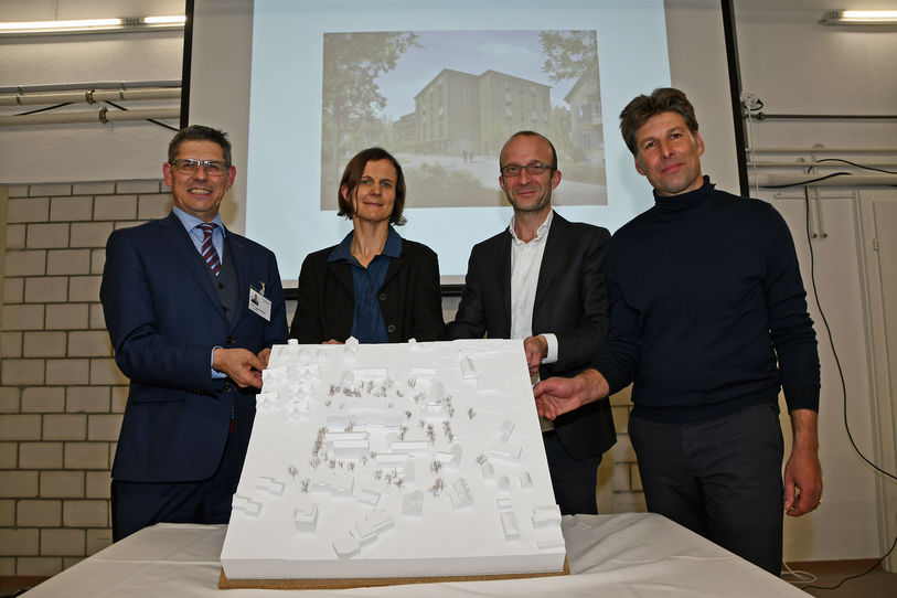 Zwei weitere Gäste erkundigten sich nach den Zufahrten und der – heimlich reduzierten? – Zahl der Parkplätze. Toggenburger stellte klar: «Dies ist kein öffentliches Parkhaus.» Eigentlich dachte die Vita-Futura-Führung, der Betrieb käme mit etwas weniger Parkfeldern aus, doch die Gemeinde habe das abgelehnt. Rund hundert Parkplätze entsprächen den Vorgaben. Entgegen früherer Pläne bleibt es bei der bisherigen Zufahrt ins bisherige, aber zu erweiternde Parkhaus. Einen Gegenuhrzeiger-Verkehr via Austrasse liess man, zugunsten derer Anwohner und der einfacheren Orientierung, wieder fallen. Nicht aber der Grundsatz, dass der Platz zwischen den Gebäuden nur Fuss- und Veloverkehr ermöglicht. Ausser natürlich in Notfällen mit Blaulicht.