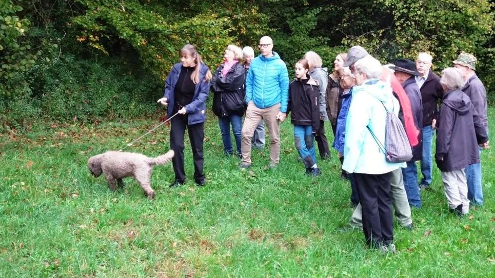 Flugs wurden zwei Gruppen gebildet, je eine mit dem Pilzkontrolleur Heinz Eisele und eine mit dem Trüffelhund Evin und der Hundeführerin Andrea Küchler. Der Trüffelhund der italienischen Rasse Lagotto ist 9-jährig und von jung an sorgfältig auf die Trüffelsuche geschult worden. Er ist sehr aufmerksam, aktiv, freut sich am Leben und ist gut erzogen. Andrea Küchler weiss alles über den Hund, die Pilze und deren möglichen Standorte. Nach lebhaften Berichten über die Trüffelhunde in Rumänien und Italien, ging es los zum nahen Waldrand. Kaum ab der Leine, legte Evin los und suchte mit einem Zickzackmuster den Waldboden ab. Er war so effizient, dass er einen Trüffel freischarrte und die Hundeführerin sich beeilen musste, damit der Hund den Pilz nicht aufass.