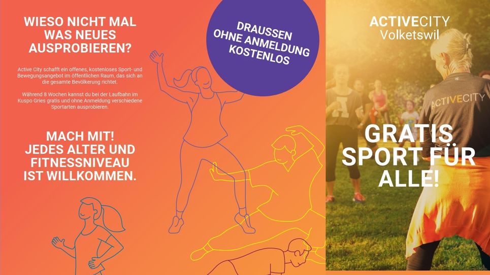 Sport und Spass für alle, gemeinsam draussen aktiv sein, kostenlos und ohne Anmeldung: Das ist Active City. Während acht Wochen werden in Zusammenarbeit mit lokalen Sportvereinen und Sportanbietenden 60 attraktive, kostenlose und professionell begleitete Sport- und Bewegungskurse angeboten. Die Outdoor-Kurse finden in Volketswil bei der Laufbahn des Kultur- und Sportzentrums Gries statt. Das Angebot richtet sich an Volketswilerinnen und Volketswiler, an Firmen und deren Mitarbeitende, an Junge und Junggebliebene. Auch auswärtigen Sportbegeisterten stehen die Kurse offen. Mitmachen können alle, das Fitnesslevel spielt keine Rolle und Vorkenntnisse sind nicht erforderlich. Von bekannten Sportarten bis zu neuen Fitnesstrends ist für alle etwas im Programm dabei: Bootcamp, Zumba, Piloxing, Familienplausch mit der KJAV, Karate mit dem Budo Club, Qi Gong, Yoga, Pilates, Breakdance für Kinder und Jugendliche. 2 Der Bereich Prävention der Gemeinde Volketswil organisiert das Sportförderprojekt gemeinsam mit der Schweizerischen Gesundheitsstiftung Radix. Neben der Trägerschaft von Radix wird die Durchführung von nationalen Partnern und dem Sportamt des Kantons Zürich als Hauptpartner unterstützt.