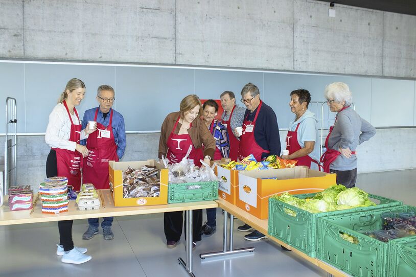 Bevor die ersten Personen eintreffen, herrscht konzentrierte Betriebsamkeit. Zehn freiwillige Helferinnen und Helfer bereiten die Waren vor. Die Lebensmittel stammen von Grossverteilern und Lebensmittelläden – Produkte, die noch essbar sind, aber oft nicht mehr verkauft würden. Co-Leiterinnen Silvia Lienhard und Vanessa Kellenberger gehen mit dem Team die Kisten durch. «Kartoffeln haben wir heute genug, davon könnt ihr eine Handvoll geben», sagt Kellenberger und zählt die Portionen ab. Am Schluss soll jede Person ungefähr gleich viel bekommen. «Was schwierig ist, weil wir gar nicht wissen, wie viele schliesslich kommen», sagt Lienhard .