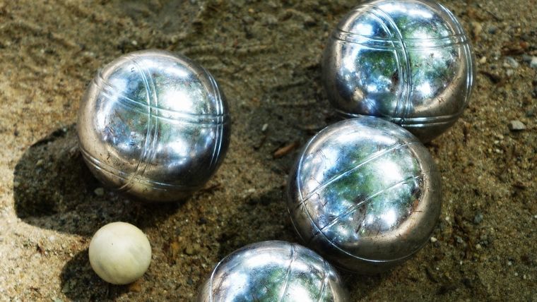 Beim Boccia-/Pétanquespielen trifft sich Volketswil auf dem Kiesplatz vor dem Restaurant Griespark (Kirchweg 30); mit Steintischen und -stühlen und...
